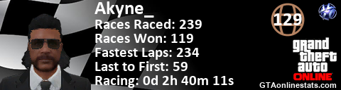 [URL=http://GTAonlinestats.com/showplayer/Akyne_][IMG]http://GTAonlinestats.com/racesignature/Akyne_/sig.png[/IMG][/URL]
