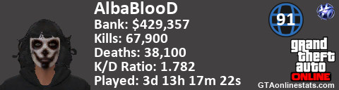 [URL=http://GTAonlinestats.com/showplayer/AlbaBlooD/2][IMG]http://GTAonlinestats.com/signature/AlbaBlooD/2/sig.png[/IMG][/URL]