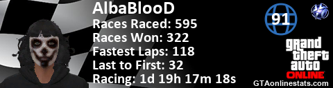 [URL=http://GTAonlinestats.com/showplayer/AlbaBlooD/2][IMG]http://GTAonlinestats.com/racesignature/AlbaBlooD/2/sig.png[/IMG][/URL]