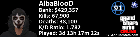 <a href="http://GTAonlinestats.com/showplayer/AlbaBlooD/2"><img src="http://GTAonlinestats.com/signature/AlbaBlooD/2/sig.png" alt="AlbaBlooD" border="0" /></a>