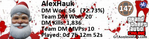 [URL=http://GTAonlinestats.com/showplayer/AlexHauk][IMG]http://GTAonlinestats.com/dmsignature/AlexHauk/sig.png[/IMG][/URL]