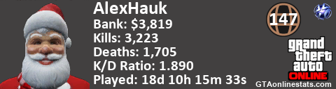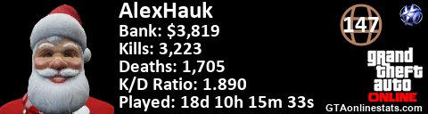 <a href="http://GTAonlinestats.com/showplayer/AlexHauk"><img src="http://GTAonlinestats.com/signature/AlexHauk/sig.png" alt="AlexHauk" border="0" /></a>