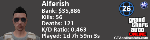 [URL=http://GTAonlinestats.com/showplayer/Alferish][IMG]http://GTAonlinestats.com/signature/Alferish/sig.png[/IMG][/URL]