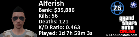 <a href="http://GTAonlinestats.com/showplayer/Alferish"><img src="http://GTAonlinestats.com/signature/Alferish/sig.png" alt="Alferish" border="0" /></a>