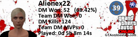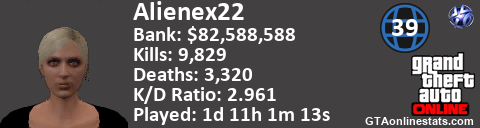 [URL=http://GTAonlinestats.com/showplayer/Alienex22/2][IMG]http://GTAonlinestats.com/signature/Alienex22/2/sig.png[/IMG][/URL]