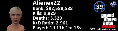 <a href="http://GTAonlinestats.com/showplayer/Alienex22/2"><img src="http://GTAonlinestats.com/signature/Alienex22/2/sig.png" alt="Alienex22" border="0" /></a>