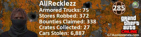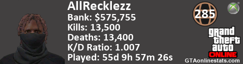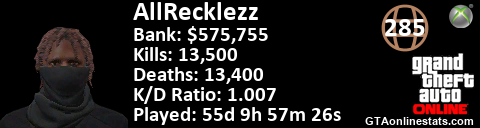 [URL=http://GTAonlinestats.com/showplayer/AllRecklezz][IMG]http://GTAonlinestats.com/greysignature/AllRecklezz/sig.png[/IMG][/URL]
