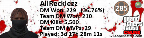 [URL=http://GTAonlinestats.com/showplayer/AllRecklezz][IMG]http://GTAonlinestats.com/dmsignature/AllRecklezz/sig.png[/IMG][/URL]
