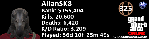 [URL=http://GTAonlinestats.com/showplayer/AllanSK8][IMG]http://GTAonlinestats.com/signature/AllanSK8/sig.png[/IMG][/URL]