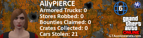 [URL=http://GTAonlinestats.com/showplayer/AllyPIERCE/2][IMG]http://GTAonlinestats.com/crimesignature/AllyPIERCE/2/sig.png[/IMG][/URL]