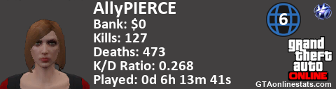 [URL=http://GTAonlinestats.com/showplayer/AllyPIERCE/2][IMG]http://GTAonlinestats.com/signature/AllyPIERCE/2/sig.png[/IMG][/URL]