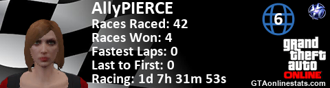 [URL=http://GTAonlinestats.com/showplayer/AllyPIERCE/2][IMG]http://GTAonlinestats.com/racesignature/AllyPIERCE/2/sig.png[/IMG][/URL]