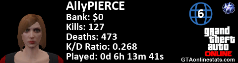 <a href="http://GTAonlinestats.com/showplayer/AllyPIERCE/2"><img src="http://GTAonlinestats.com/signature/AllyPIERCE/2/sig.png" alt="AllyPIERCE" border="0" /></a>