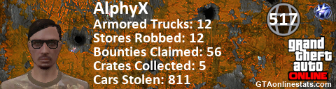 [URL=http://GTAonlinestats.com/showplayer/AlphyX][IMG]http://GTAonlinestats.com/crimesignature/AlphyX/sig.png[/IMG][/URL]