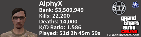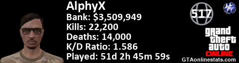 <a href="http://GTAonlinestats.com/showplayer/AlphyX"><img src="http://GTAonlinestats.com/randomsignature/AlphyX/sig.png" alt="AlphyX" border="0" /></a>