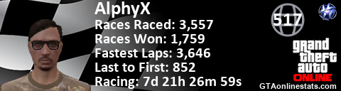 <a href="http://GTAonlinestats.com/showplayer/AlphyX"><img src="http://GTAonlinestats.com/racesignature/AlphyX/sig.png" alt="AlphyX" border="0" /></a>