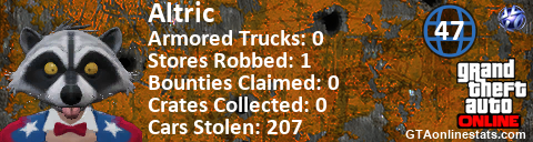 [URL=http://GTAonlinestats.com/showplayer/Altric/2][IMG]http://GTAonlinestats.com/crimesignature/Altric/2/sig.png[/IMG][/URL]