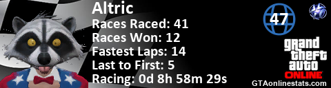 [URL=http://GTAonlinestats.com/showplayer/Altric/2][IMG]http://GTAonlinestats.com/racesignature/Altric/2/sig.png[/IMG][/URL]