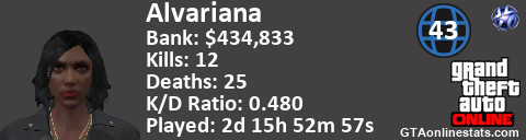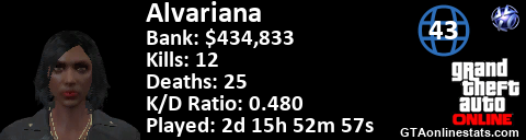 <a href="http://GTAonlinestats.com/showplayer/Alvariana"><img src="http://GTAonlinestats.com/signature/Alvariana/sig.png" alt="Alvariana" border="0" /></a>