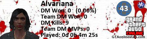 [URL=http://GTAonlinestats.com/showplayer/Alvariana][IMG]http://GTAonlinestats.com/dmsignature/Alvariana/sig.png[/IMG][/URL]