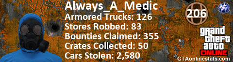 <a href="http://GTAonlinestats.com/showplayer/Always_A_Medic"><img src="http://GTAonlinestats.com/randomsignature/Always_A_Medic/sig.png" alt="Always_A_Medic" border="0" /></a>