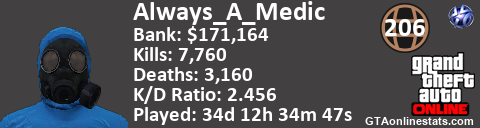 [URL=http://GTAonlinestats.com/showplayer/Always_A_Medic][IMG]http://GTAonlinestats.com/dmsignature/Always_A_Medic/sig.png[/IMG][/URL]