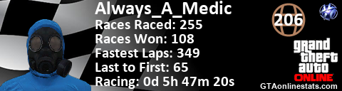 <a href="http://GTAonlinestats.com/showplayer/Always_A_Medic"><img src="http://GTAonlinestats.com/racesignature/Always_A_Medic/sig.png" alt="Always_A_Medic" border="0" /></a>