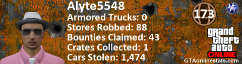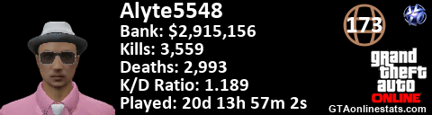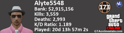 <a href="http://GTAonlinestats.com/showplayer/Alyte5548"><img src="http://GTAonlinestats.com/randomsignature/Alyte5548/sig.png" alt="Alyte5548" border="0" /></a>