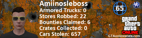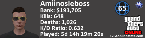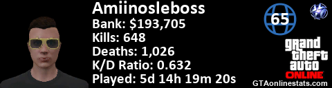 <a href="http://GTAonlinestats.com/showplayer/Amiinosleboss"><img src="http://GTAonlinestats.com/signature/Amiinosleboss/sig.png" alt="Amiinosleboss" border="0" /></a>
