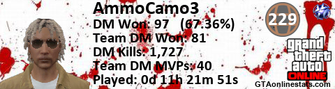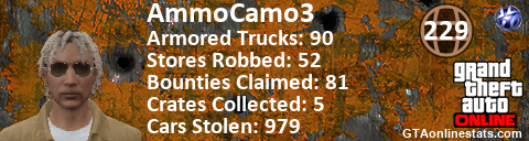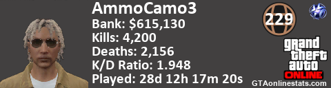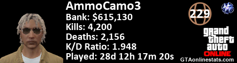 <a href="http://GTAonlinestats.com/showplayer/AmmoCamo3"><img src="http://GTAonlinestats.com/signature/AmmoCamo3/sig.png" alt="AmmoCamo3" border="0" /></a>