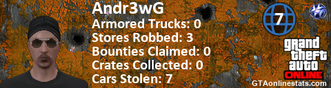 [URL=http://GTAonlinestats.com/showplayer/Andr3wG/2][IMG]http://GTAonlinestats.com/crimesignature/Andr3wG/2/sig.png[/IMG][/URL]