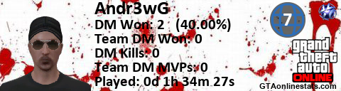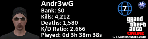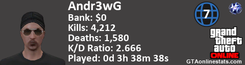 [URL=http://GTAonlinestats.com/showplayer/Andr3wG/2][IMG]http://GTAonlinestats.com/signature/Andr3wG/2/sig.png[/IMG][/URL]