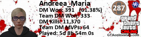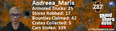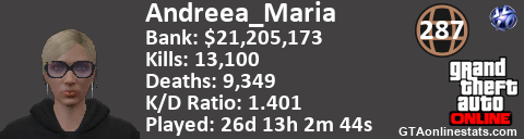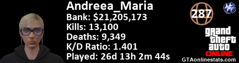 [URL=http://GTAonlinestats.com/showplayer/Andreea_Maria][IMG]http://GTAonlinestats.com/dmsignature/Andreea_Maria/sig.png[/IMG][/URL]