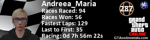 [URL=http://GTAonlinestats.com/showplayer/Andreea_Maria][IMG]http://GTAonlinestats.com/racesignature/Andreea_Maria/sig.png[/IMG][/URL]