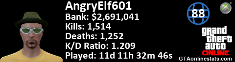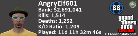 <a href="http://GTAonlinestats.com/showplayer/AngryElf601"><img src="http://GTAonlinestats.com/signature/AngryElf601/sig.png" alt="AngryElf601" border="0" /></a>