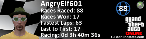 <a href="http://GTAonlinestats.com/showplayer/AngryElf601"><img src="http://GTAonlinestats.com/racesignature/AngryElf601/sig.png" alt="AngryElf601" border="0" /></a>