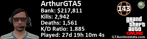 <a href="http://GTAonlinestats.com/showplayer/ArthurGTA5/2"><img src="http://GTAonlinestats.com/randomsignature/ArthurGTA5/2/sig.png" alt="ArthurGTA5" border="0" /></a>