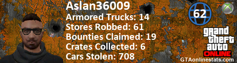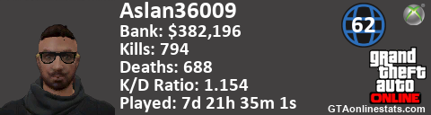 <a href="http://GTAonlinestats.com/showplayer/Aslan36009"><img src="http://GTAonlinestats.com/signature/Aslan36009/sig.png" alt="Aslan36009" border="0" /></a>