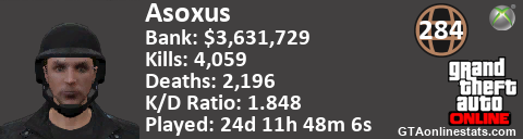 [URL=http://GTAonlinestats.com/showplayer/Asoxus][IMG]http://GTAonlinestats.com/dmsignature/Asoxus/sig.png[/IMG][/URL]