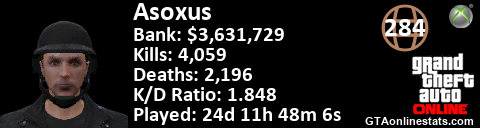 [URL=http://GTAonlinestats.com/showplayer/Asoxus][IMG]http://GTAonlinestats.com/signature/Asoxus/sig.png[/IMG][/URL]
