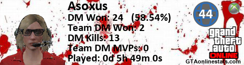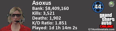 [URL=http://GTAonlinestats.com/showplayer/Asoxus/2][IMG]http://GTAonlinestats.com/dmsignature/Asoxus/2/sig.png[/IMG][/URL]