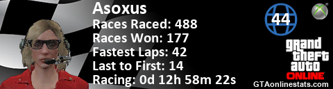 [URL=http://GTAonlinestats.com/showplayer/Asoxus/2][IMG]http://GTAonlinestats.com/racesignature/Asoxus/2/sig.png[/IMG][/URL]