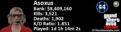 <a href="http://GTAonlinestats.com/showplayer/Asoxus/2"><img src="http://GTAonlinestats.com/signature/Asoxus/2/sig.png" alt="Asoxus" border="0" /></a>