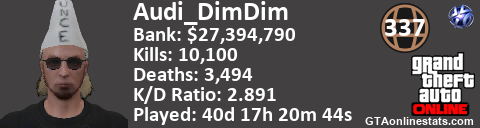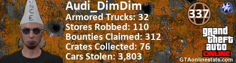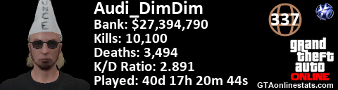 [URL=http://GTAonlinestats.com/showplayer/Audi_DimDim/2][IMG]http://GTAonlinestats.com/signature/Audi_DimDim/2/sig.png[/IMG][/URL]