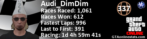 [URL=http://GTAonlinestats.com/showplayer/Audi_DimDim/2][IMG]http://GTAonlinestats.com/racesignature/Audi_DimDim/2/sig.png[/IMG][/URL]