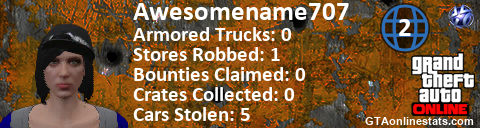 [URL=http://GTAonlinestats.com/showplayer/Awesomename707/2][IMG]http://GTAonlinestats.com/crimesignature/Awesomename707/2/sig.png[/IMG][/URL]