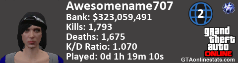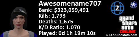 <a href="http://GTAonlinestats.com/showplayer/Awesomename707/2"><img src="http://GTAonlinestats.com/signature/Awesomename707/2/sig.png" alt="Awesomename707" border="0" /></a>