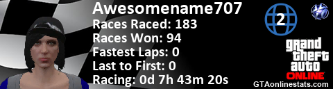 <a href="http://GTAonlinestats.com/showplayer/Awesomename707/2"><img src="http://GTAonlinestats.com/racesignature/Awesomename707/2/sig.png" alt="Awesomename707" border="0" /></a>