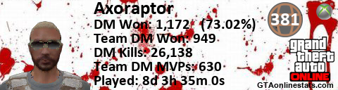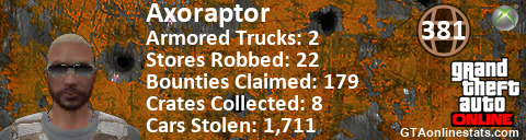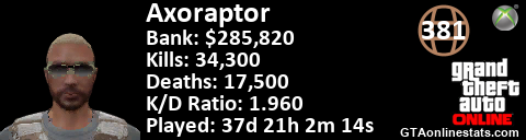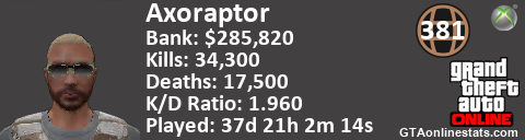 [URL=http://GTAonlinestats.com/showplayer/Axoraptor][IMG]http://GTAonlinestats.com/signature/Axoraptor/sig.png[/IMG][/URL]