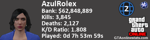 [URL=http://GTAonlinestats.com/showplayer/AzulRolex/2][IMG]http://GTAonlinestats.com/signature/AzulRolex/2/sig.png[/IMG][/URL]